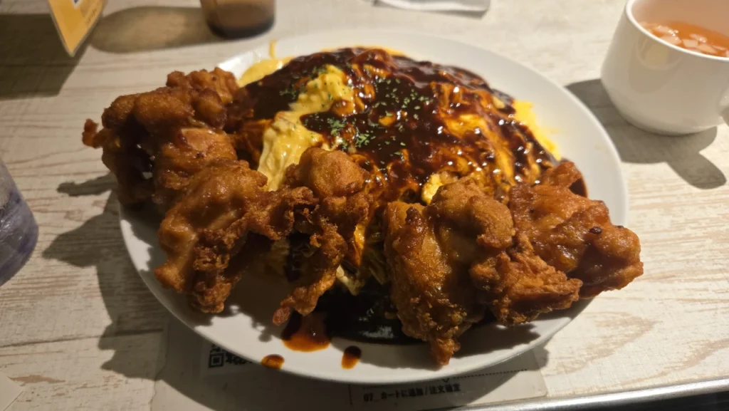 晩飯は新橋の男のオムライスEGG BOMBで2倍唐揚げオムライス。ライスの量が600gまで無料なのが良い。